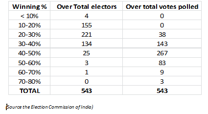 Now, the electoral system in India is “first past the post”, which means that there is requirement for an absolute majority the winner is he who gets the maximum number of votes. This could vary as much as 70% for a candidate to merely a 20% of the total votes polled. It is often observed that the candidates mostly only secure less than even 40% votes to secure an election. The chart below shows the figures for the 2009 general elections: